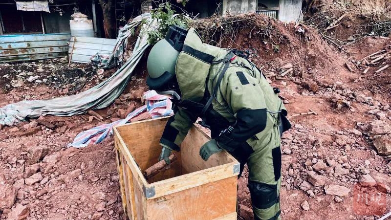 随后,排爆小组队员确定“炸弹”具体位置,经排爆手确认:“炸弹”为迫击炮、60炮、手榴弹等,虽生锈,但仍有爆炸可能,杀伤力极大。对此,排爆小组迅速研究制定排爆方案,主排爆手穿着近70斤重的排爆服进入现场展开行动。