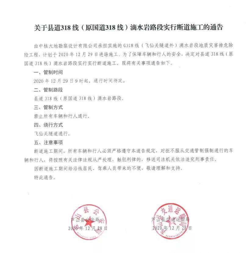 12月29日,记者芦山交警处获悉,由中核大地勘察设计有限公司承担实施的G318线(飞仙关隧道外)滴水岩段地质灾害排危除险工程,计划于2020年12月29日进场施工。为了保障车辆和行人的安全,决定对县道318线(原国道318线)滴水岩路段实行实行断道施工。