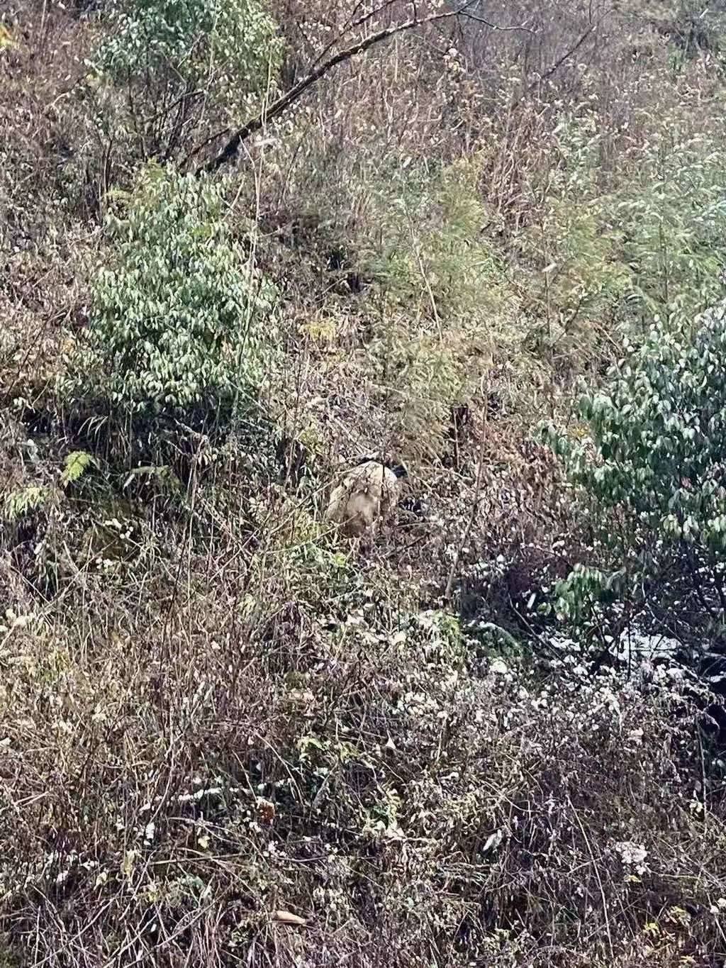 兴奋时刻,赵兴键拿出手机边拍视频边打招呼:“胖胖,胖胖!hello,胖胖,别跑!”可能是听到声音有些害怕,这只大熊猫突然走下公路,往深山老林中“逃”去了。