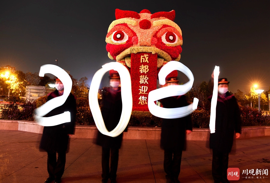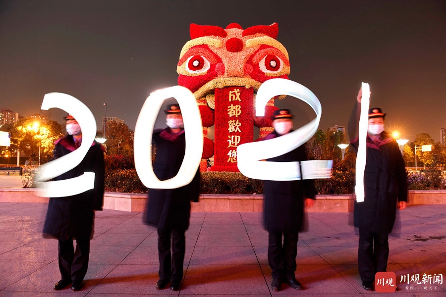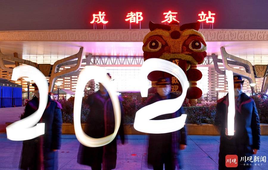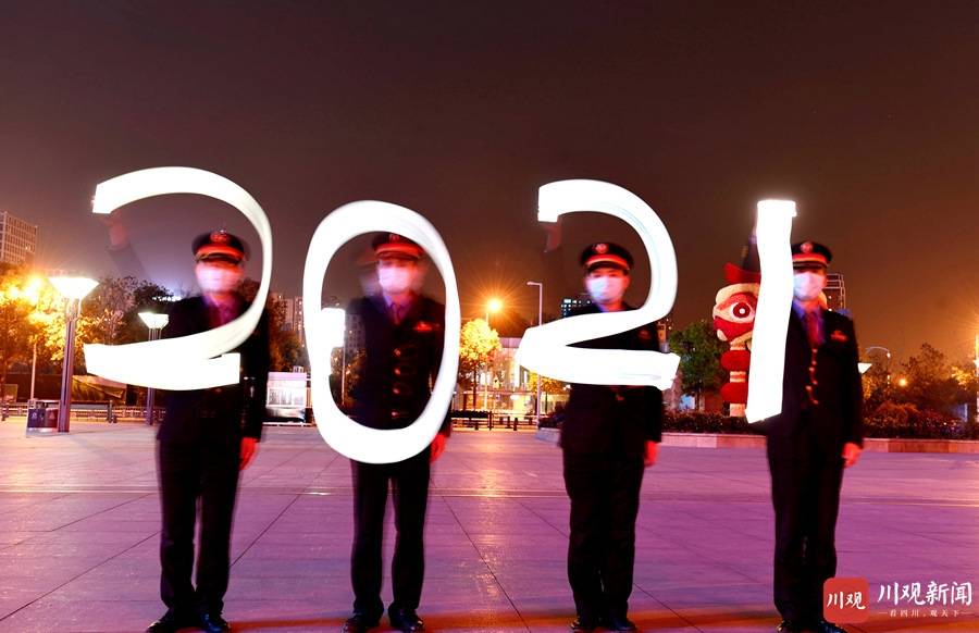 12月29日晚,在成都火车东站广场,来自中国铁路成都局集团公司成都客运段北京一队的工作人员在空中用手机屏写出“2021”字样,以饱满的热情迎接新年的到来。