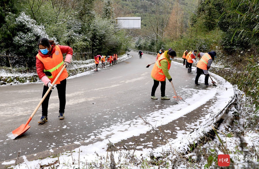 华蓥市公路管理养护段工人,在对结冰路段紧急除冰作业,保障交通安全。