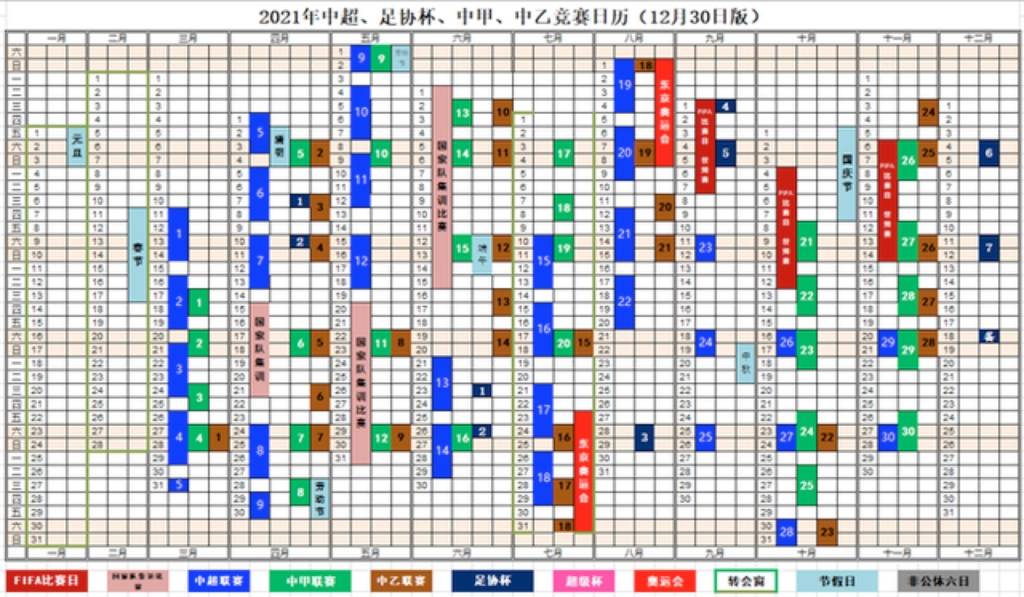 12月30日,中国足协召开中超、中甲俱乐部联席会议。会议上,中国足协给出了新赛季的预案,方便各俱乐部做好季前准备工作。根据图表显示,2021中超联赛将于3月11日开战,11月28日结束,恢复30轮比赛。中甲联赛于3月17日开战,11月28日结束,同为30轮。足协杯穿插各项赛事进行,日期为4月7日至12月12日之间。