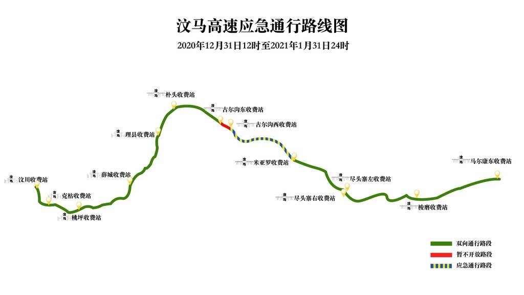 通行方案是:古尔沟西收费站至米亚罗收费站段为应急通行路段。汶川至马尔康方向,在汶马高速古尔沟东收费站出站,经国道317线在古尔沟西收费站进站前往马尔康方向。马尔康至汶川方向,在汶马高速马尔康东收费站进站,沿汶马高速至古尔沟西收费站出站,经国道317线在古尔沟东收费站进站。