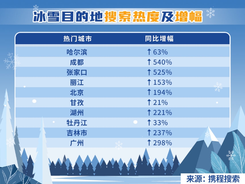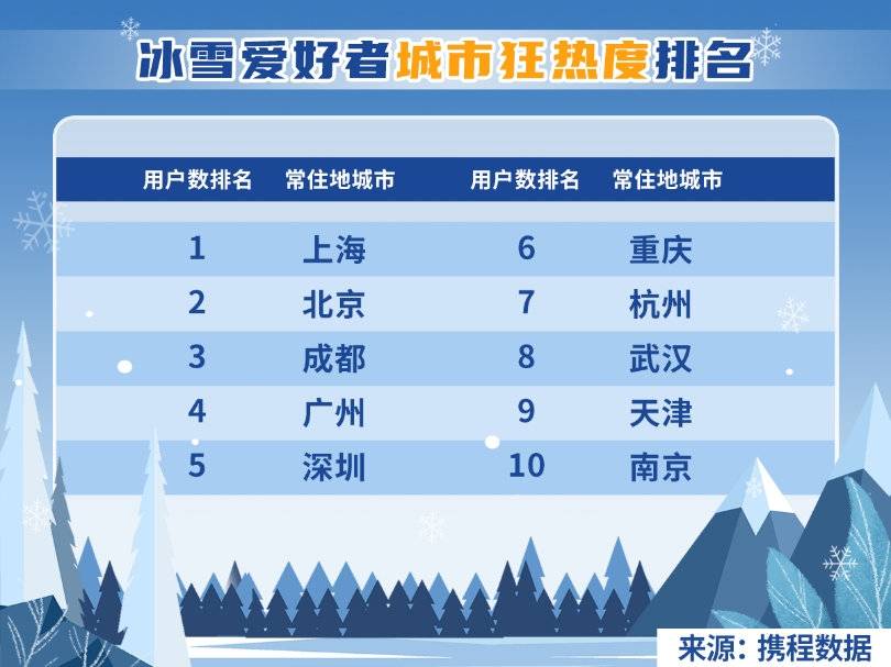 携程数据显示,滑雪玩家中,90后、00后用户占比达56%,滑雪爱好者来自一线城市与新一线城市的占比高达53%。排名前十位的滑雪爱好者大多来自上海、成都、广州、深圳等南方城市,其中成都跻身冰雪爱好者城市狂热度榜单前三。冰雪旅游中关于成都的搜索量在短时间内上涨540%。