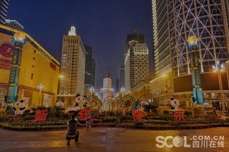 清晨的天府广场,鲜花簇拥,彩旗飘扬,呈现出一派喜庆热烈的节日景象。