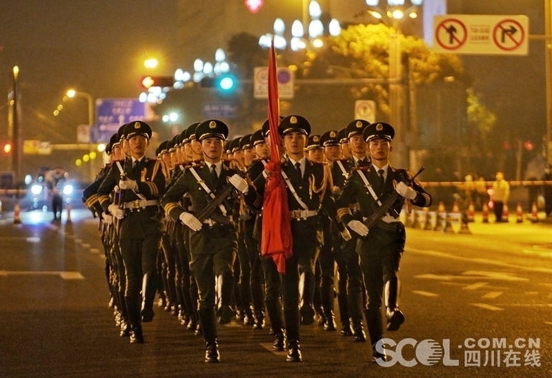 6点55分,“蓉城国旗护卫队”官兵迈着铿锵有力的步伐,踩着《歌唱祖国》的音乐节奏迈入天府广场。