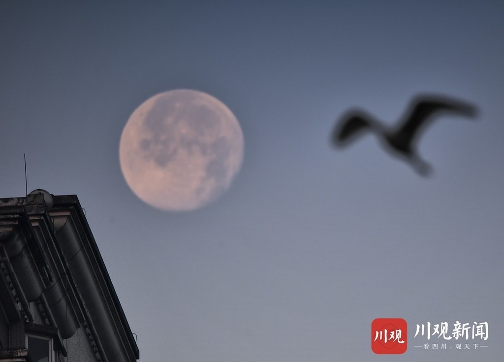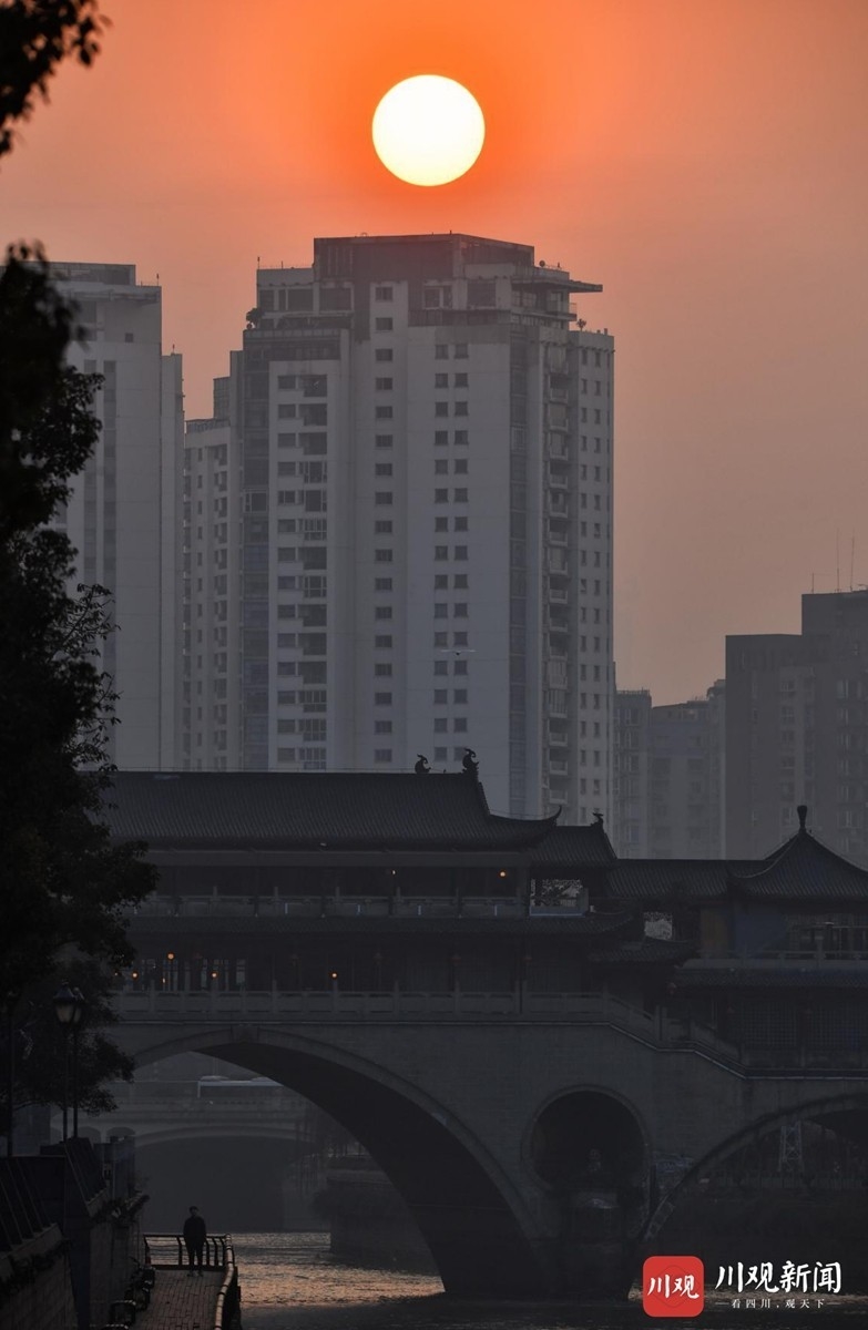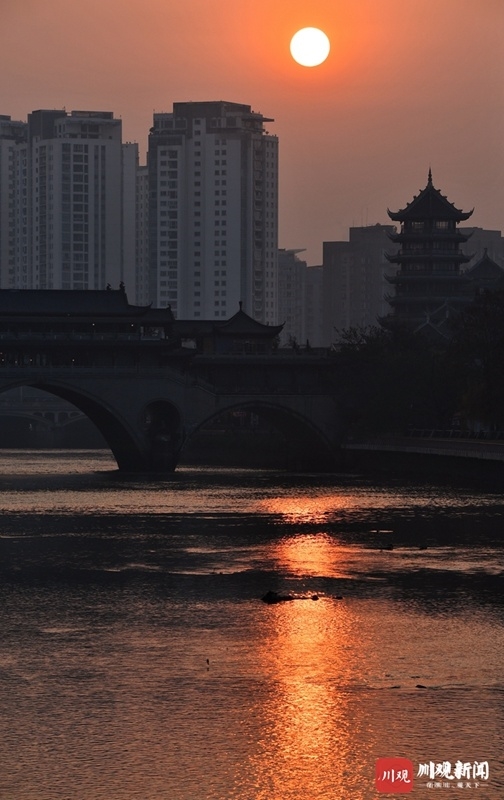2021年1月1日,新年第一天,一轮红日在从成都市东方冉冉升起,同时月亮还挂在天边一起迎接新年到来。