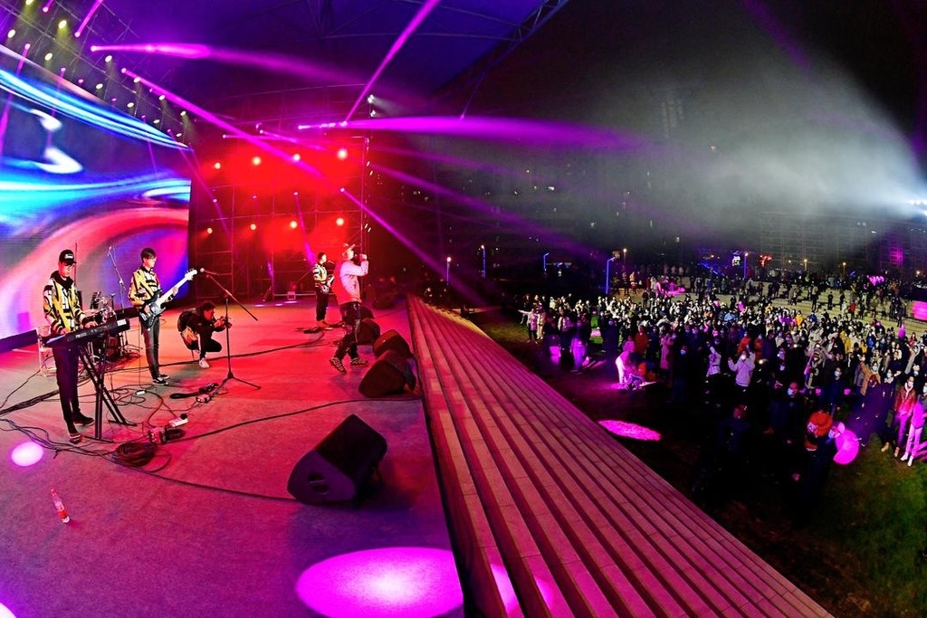 随着夜幕降临,“烟火有声”音乐主题派对惊喜上线,伴着乐队弹唱表演,一场街头音乐派对瞬间点燃音乐坊的节日氛围。