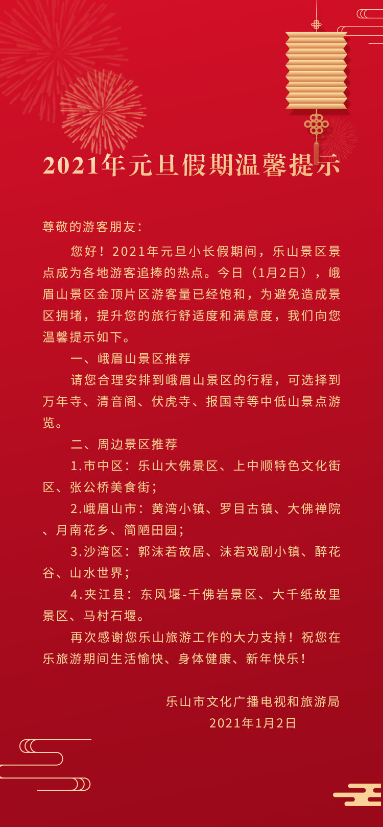 1月2日中午,记者从乐山市文化广播电视和旅游局获悉, 2021年元旦小长假期间,乐山景区景点成为各地游客追捧的热点,当日峨眉山景区金顶片区游客量已经饱和,为避免造成景区拥堵,提升游客旅行舒适度和满意度,该局向广大游客发出温馨提示合理安排行程,并推荐周边景区景点。