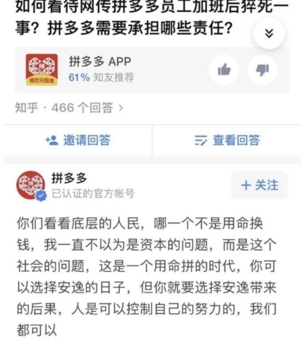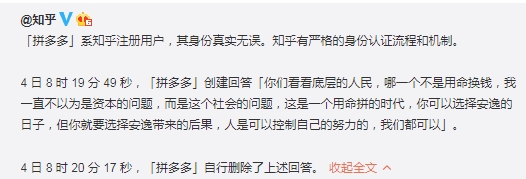 此前媒体报道,一名供职于拼多多旗下多多买菜业务的23岁女性在凌晨1点下班的路上猝死。随后,知乎网友发问:如何看待网传#拼多多员工#加班后猝死一事?1月4日8时19分49秒,“拼多多”创建回答:你看底层的人民,哪一个不是用命换钱,我一直不认为是资本的问题,而是这个社会的问题,这是一个用命拼的时代。1月4日8时20分17秒,“拼多多”自行删除了上述回答。