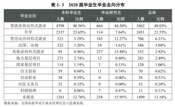 四川农业大学 2020 届毕业生共 11372 人,其中毕业研究生 1492 人,占毕业生总人数的13.12%;本科毕业生 9880 人,占毕业生总人数的 86.88%。