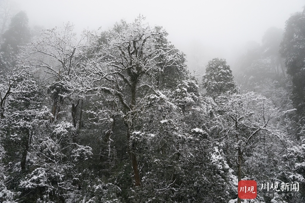 1月5日,位于雅安市荥经县的龙苍沟国家森林公园银装素裹。当日,龙苍沟下起雨夹雪,大山之中云雾缭绕,杉松的挺拔掩映在皑皑白雪中,仿佛置身童话世界。