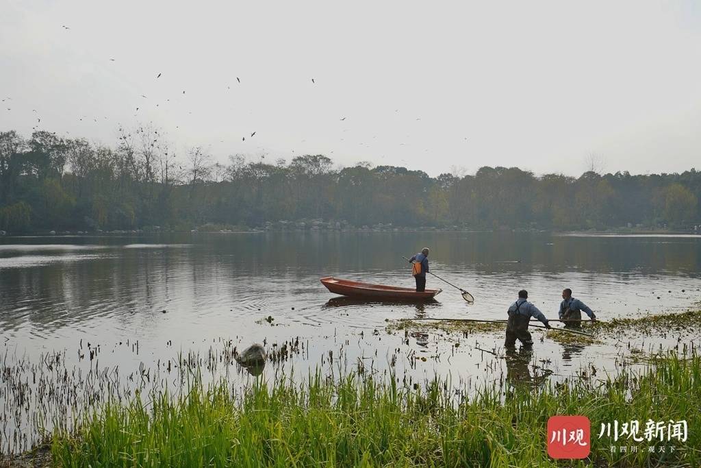 小寒这天季节交错,室外河湖水温也开始降至冰点,成都浣花溪一年一次的湖面水杂草清理工作也在这天开始。