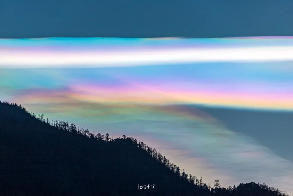 “七彩云”的具体成因是,在晴朗的天气状况下,太阳光正好和云构成一个合适的角度,太阳光穿过云彩时,通过折射和反射作用,云彩内的水汽将太阳光谱分离,从而散射出七色光芒。