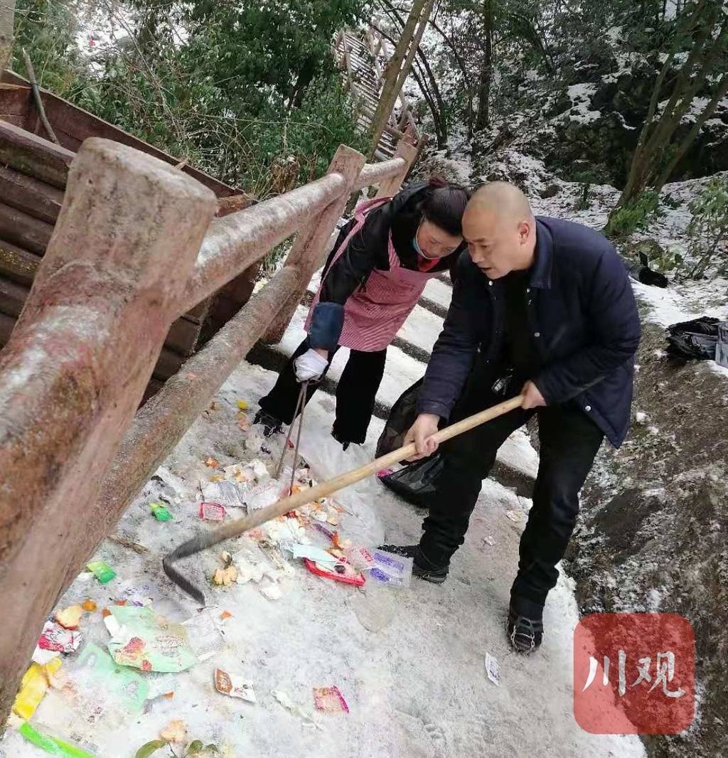 6日下午14:00开始,当地已经动员所在镇村社区干部群众、志愿者和农家乐协会人员300余人,沿九峰山上下山路,捡拾清扫垃圾,因道路结冰湿滑垃圾清运预计将耗时3天才能完成。截止1月6日18:00时,已清理垃圾1吨。“目前,低海拔地区的垃圾已经清理完毕,争取在本周五(8日)前将山上的垃圾全部清理干净,让美景回归大众视线。”该负责人说。