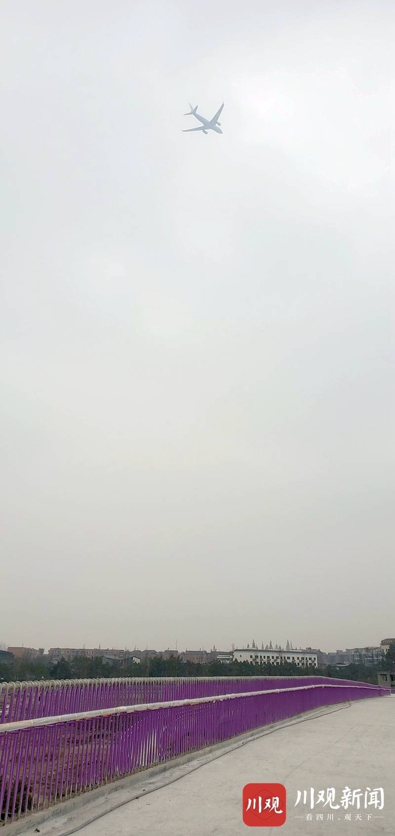 除了亮眼的紫色,这座跨成双大道及江安河桥还给了记者一个小惊喜,站在桥上,能清楚地看到从成都双流国际机场起降的航班。