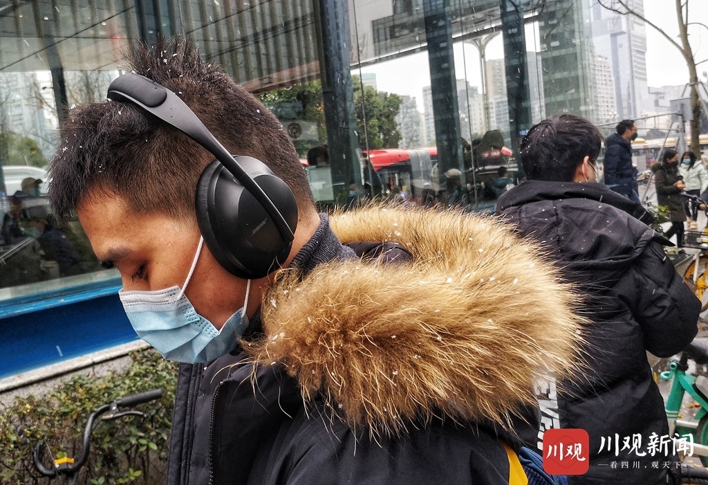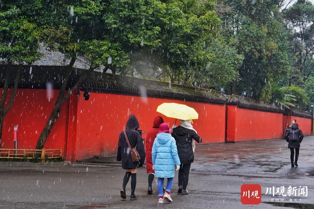 强降温从小寒后开始,1月7日天气预报成都气温最低至零度,一夜寒冬细雨到清晨终于变成小雪,从早高峰开始,城区密集的雪花让上班族感受到成都今年第一场雪的寒意。从天府五街到高升桥,一路行来,密集细雪渐渐弥漫整个城区,武侯祠南郊公园在这飘洒的细雪里也有了别样景致。