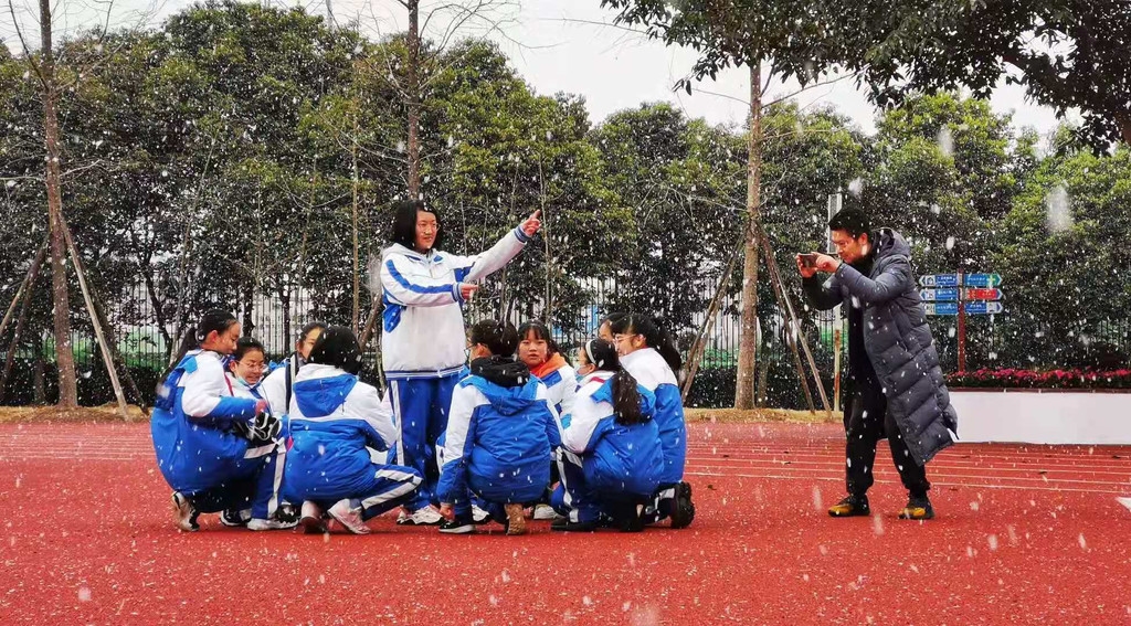相比幼儿园和小学,初中的娃儿明显要“矜持”得多,但是依然难掩内心的激动,在操场上赏雪的时候,个个脸上都挂着灿烂的笑容。