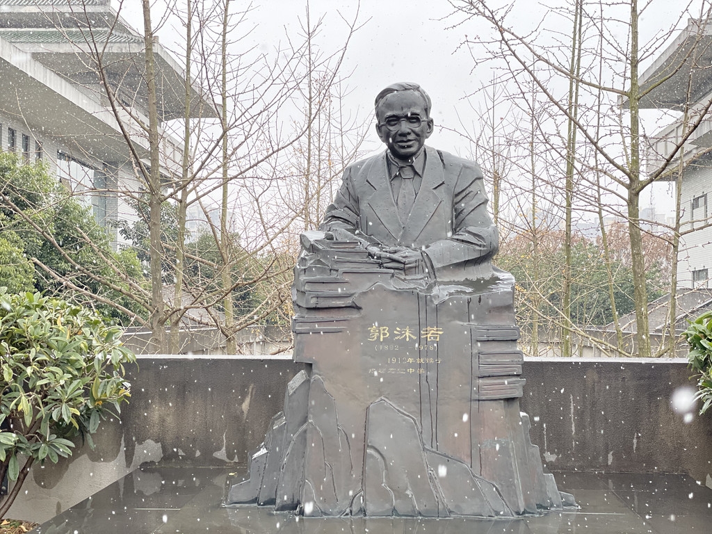 在石室中学,学生们在雪中踢足球、打篮球,而校内的古建筑、雕塑在漫天飞雪的映衬下,更加有韵味。
