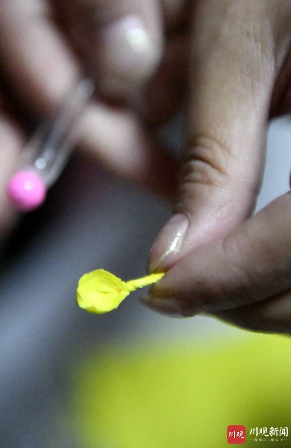 女子学员把制作好的手工仿真柿子插入瓶子里。