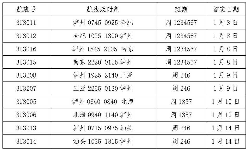 1月8日起,川航将在泸州云龙机场摆放两架过夜飞机,并以泸州为始发地,新增通往合肥、南京、汕头、三亚、北海等城市的航线。其中,泸州=合肥、泸州=南京为每天一班,泸州=三亚、泸州=汕头为每周二、四、六各一班,泸州=北海为每周一、三、五、七各一班。