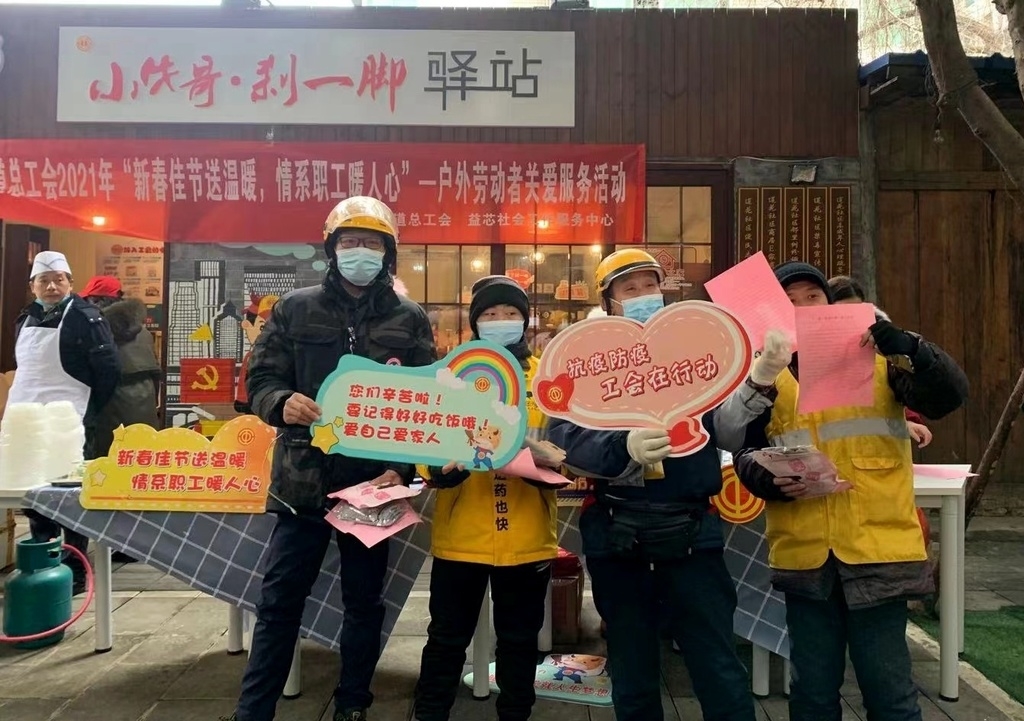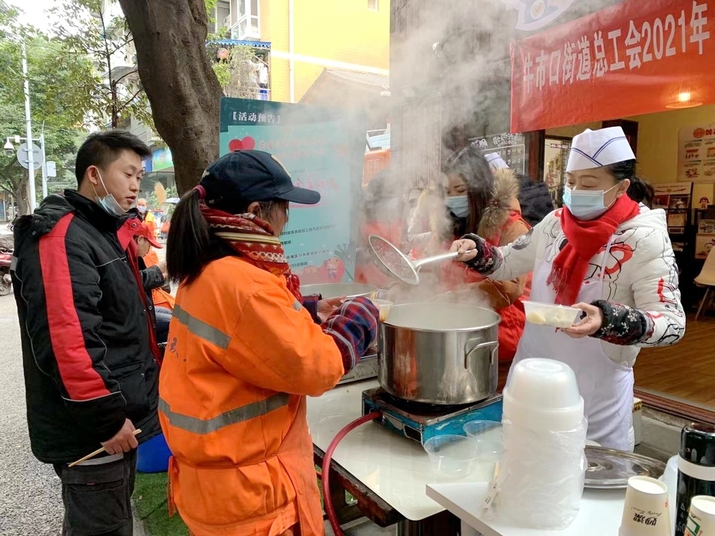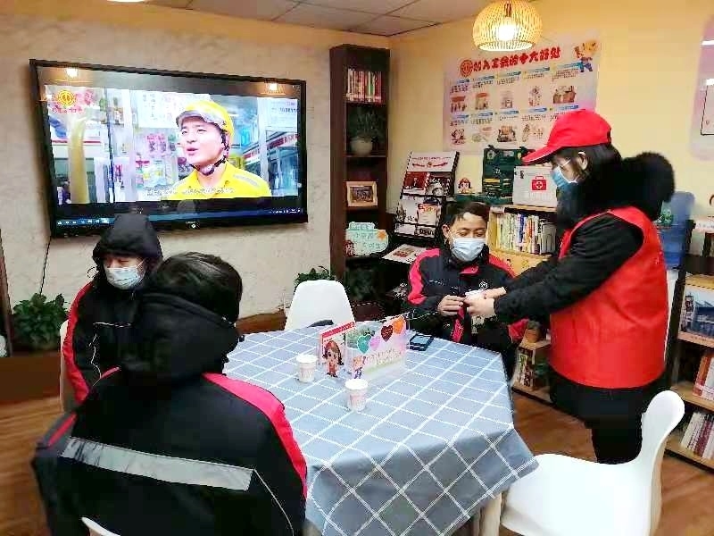 1月8日中午时分,时值成都隆冬时节,户外寒气袭人,而成都市锦江区牛市口街道“小牛哥”快递员、户外劳动者之家内却温暖如春,牛市口街道总工会“八大群体”及户外劳动者送温暖活动在这里举行,20余位环卫工、快递外卖小哥坐在温馨舒适、暖意融融的休息厅内,喝着热腾腾的茶水休息。随后,来自牛市口街道的职工志愿者们,为他们送上一碗碗热腾腾的饺子和1份关爱礼包。