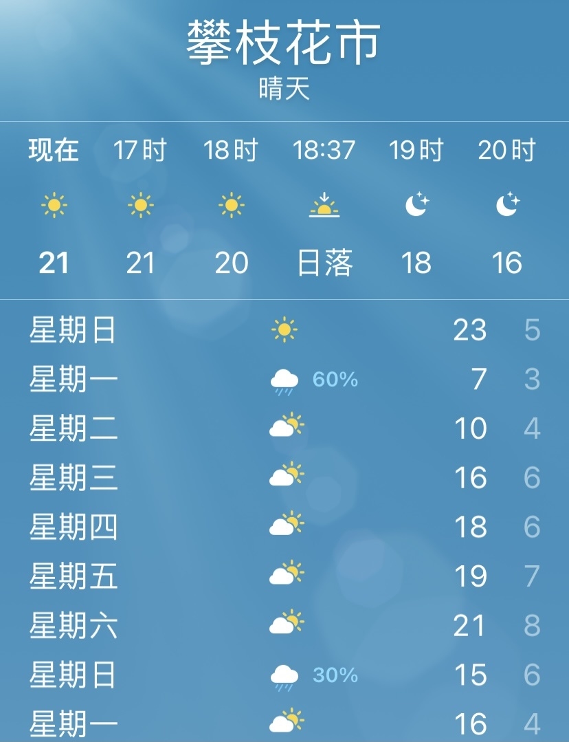1月9日16时,攀枝花市气象台发布强降温天气预报,受地面冷空气影响,1月10日晚到12日白天,攀枝花将迎来一次强降温并伴有小雨天气过程。过程期间,市区及各县(区)城区日均气温累计下降5至7 °C,最高气温降至8至10 °C,最低气温降至4-6 °C。