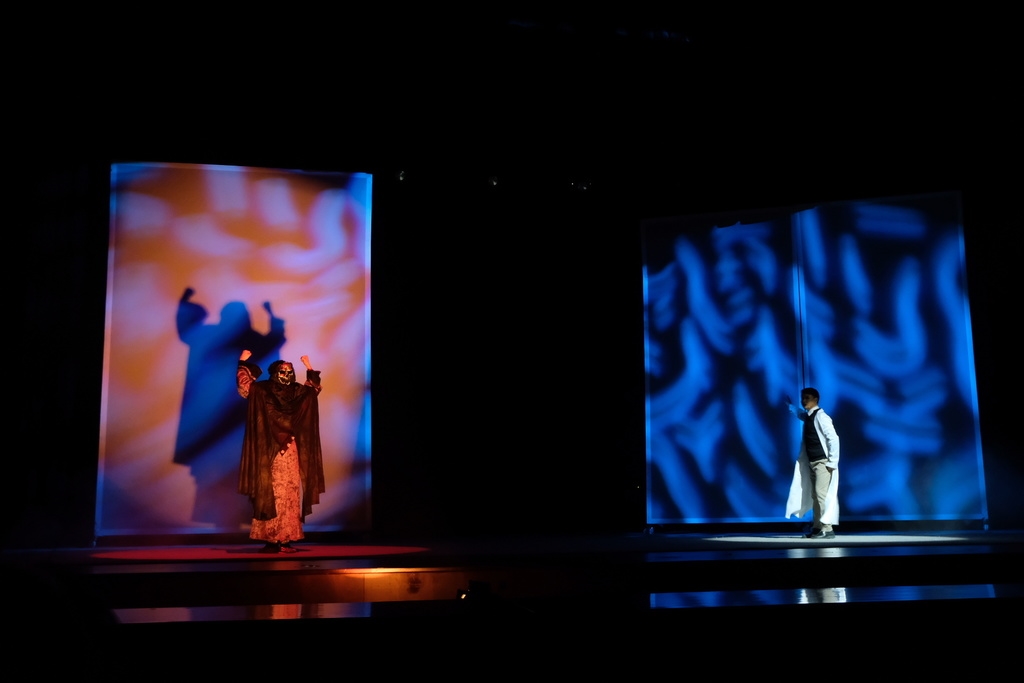 伴随着川剧特有的锣鼓声,大幕缓缓拉开。“生机不停转,生命代代传。生生复生生……”该剧主题曲《莫负平生年》先点题将观众带入故事。“穷尽一生是一生,声色犬马是一生。”“面对病魔斗一生,管他是否是芸芸众生。仁爱之心修一生。”现场舞台上,文东和王裕仁两位男主角飙戏,代表正反面斗起嘴来。有时,王裕仁饰演的“无常”还脱口而出“maybe”等英语,而文东饰演的“伊生”本职也是一位医生,他一会儿穿着白大褂,一会儿奔赴疫情一线穿上了防护服,他与华佗讨论起呼吸机、西药名字,令华佗迷惑不已。这些细节引起观众的阵阵笑声和掌声。