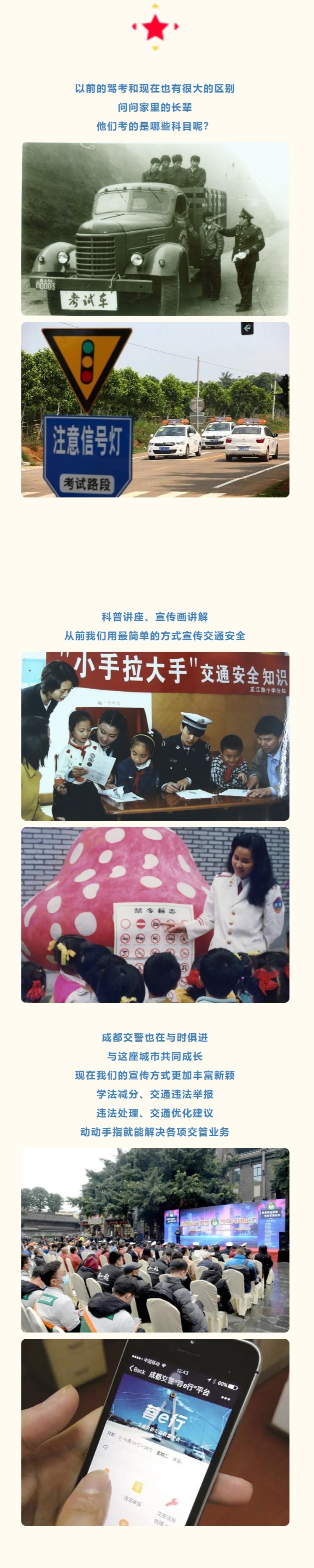 以前的驾考和现在也有很大的区别,问问家里的长辈,他们考的是哪些科目呢?科普讲座、宣传画讲解,从前是用最简单的方式宣传交通安全,现在的宣传方式更加丰富新颖,学法减分、交通违法举报;违法处理、交通优化建议;动动手指就能解决各项交管业务。