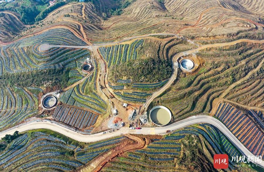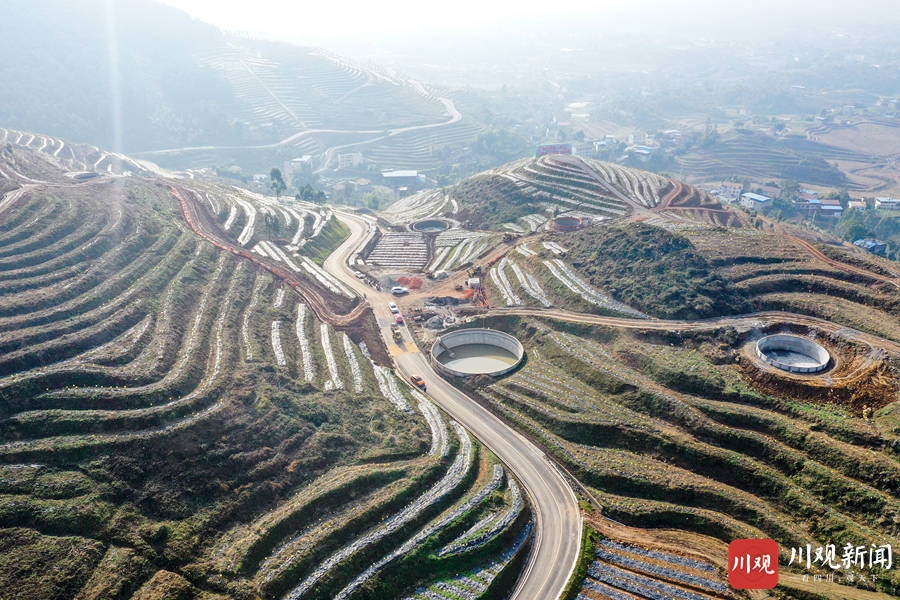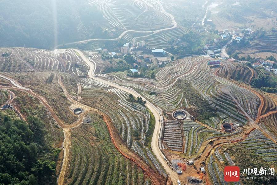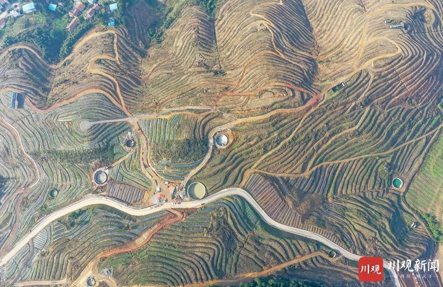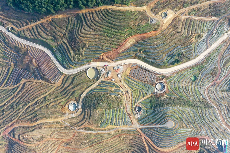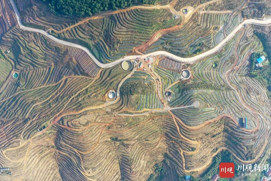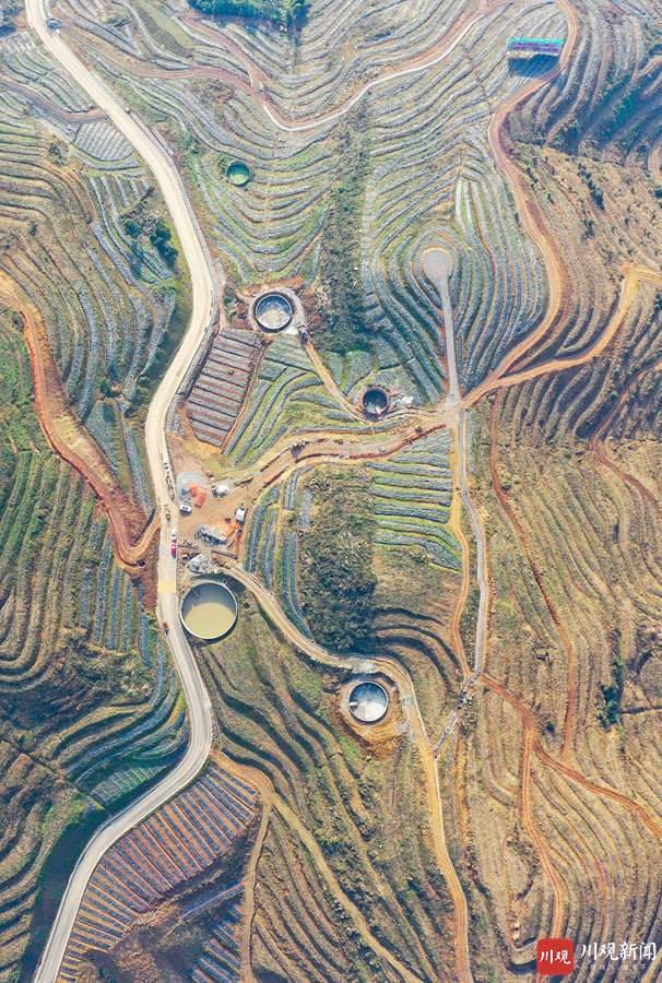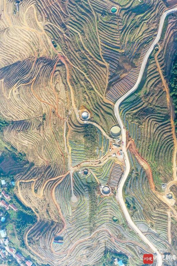 2021年1月11日,在四川省华蓥市禄市镇山门口村和华龙办事处上坝桥村航拍的即将全面竣工的沟池路渠等基础设施齐备的坡改梯工程。