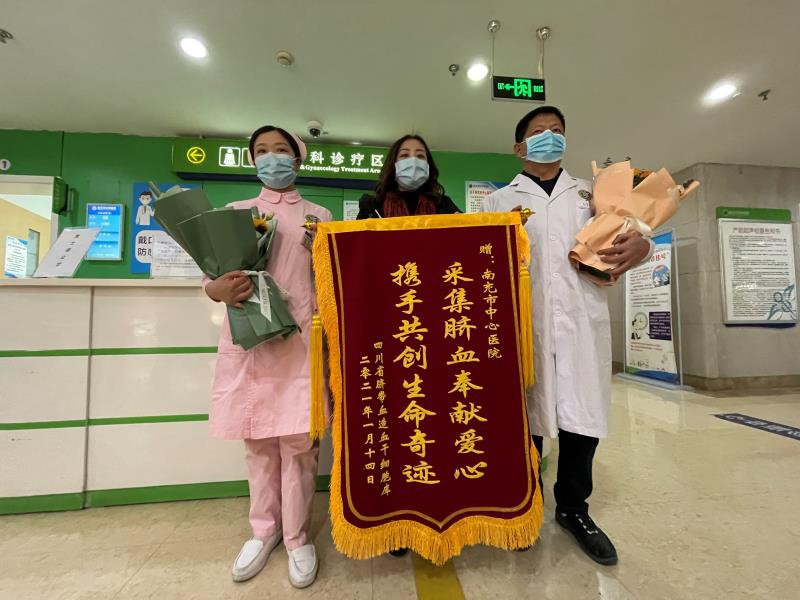 1月14日,四川省脐带血造血干细胞库工作人员罗立黎,将一面锦旗,送到了南充市中心医院产科主任谭小勇手中,向该院产科医护人员表达谢意。原来,南充市中心医院2019年采集的一份脐带血,在冻存了1年10个月之后,于2021年1月挽救了一名13岁河北女孩的生命。