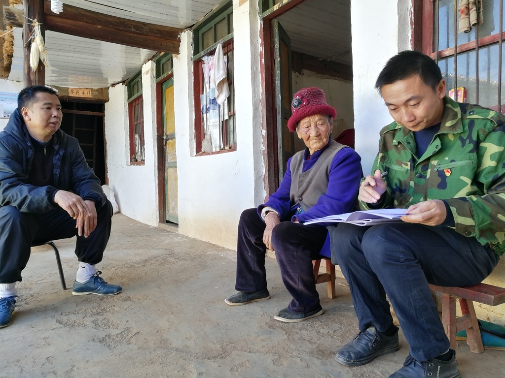 张富银(右一)在红格拉村,入户走访90岁老人。