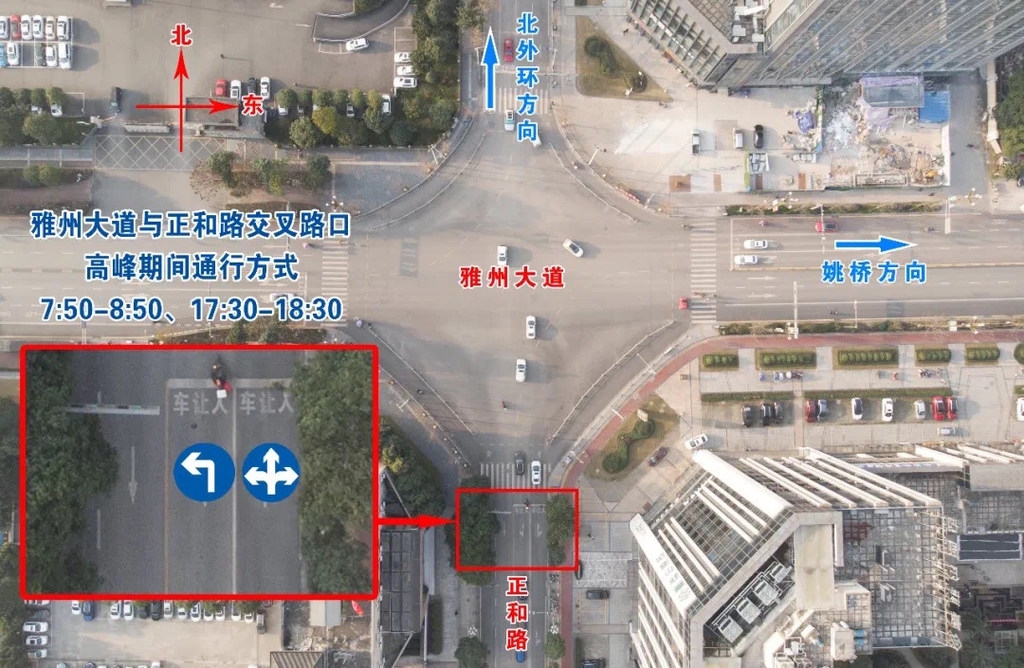 1、雅州大道与正和路交叉路口,在高峰期间(7:50-8:50、17:30-18:30),正和路由南向北方向的机动车允许借直右车道左转,直左车道禁止车辆直行。