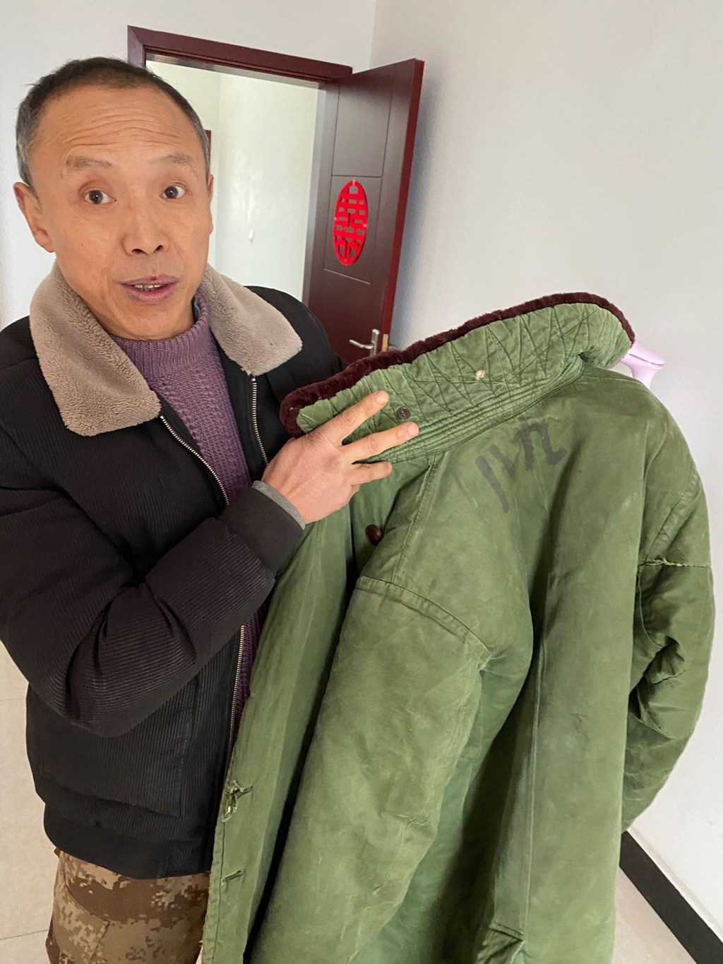 在张明洪家客厅的柜子上,一直摆放着4顶他当兵时戴过的军帽:右边那顶,是刚到部队时发的;左边的是到部队不到一年,换发新式军帽;中间的两顶迷彩帽,是他前些年参加预备役训练时发的。退伍时从部队带回来的大衣,快30年了,张明洪也一直在穿,尤其冬天在街头等活的时候,他披在身上,军营火热的记忆和大衣的温暖,让他不再感到寒冷。虽然自己文化不高,但很爱看书,而且爱看和部队有关的书。听说《雪域长歌》好看,专门讲部队的,是他还专门交代儿子从网上帮他买回来的。