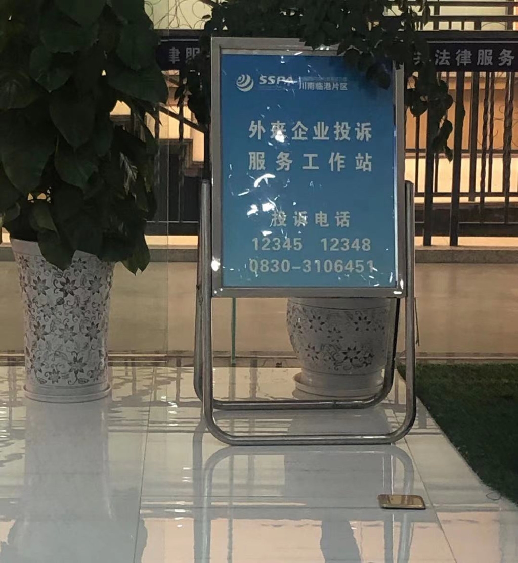 泸州市公共法律服务中心大厅内,设有外来企业投诉电话告示牌。刘钰汶摄