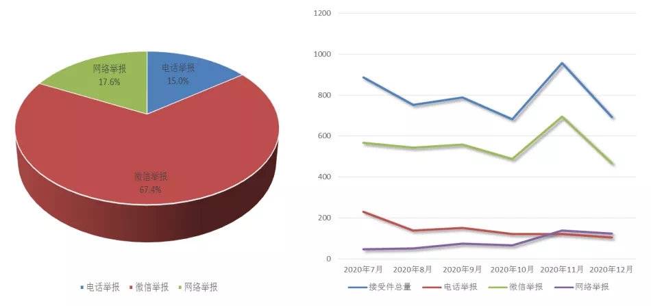 记者梳理发现,2020年12月,微信、网络举报量与去年同期持平。从污染类型看,反映大气污染问题最多,占污染举报总量的43.3%,环比上升7.3个百分比;反映噪声、水、固废、辐射及其他污染问题数分别占污染举报总量的31.7%、10.8%、7.6%、6.6%。