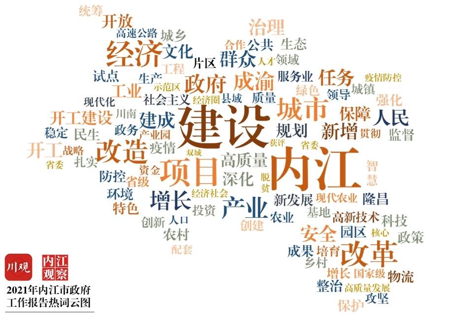 2021年1月21日上午9点,内江市七届人大七次会议开幕,内江市人民政府市长郑莉作政府工作报告。在这份1.8万字左右报告中,出现了哪些高频高频词?这些热词透露出什么信号?四川在线记者对报告的正文开展分析,用数据对报告进行解读。