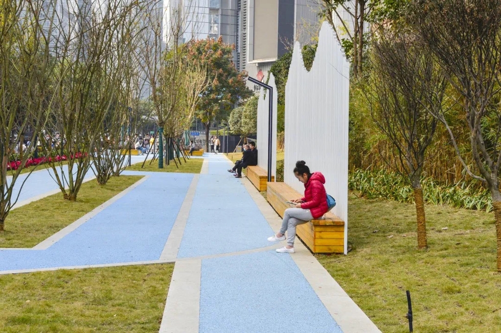 长150米、宽5米的舒朗草坪竹林景观内,趣味休憩“港湾”和层次变化丰富的绿植,营造出特色花境。