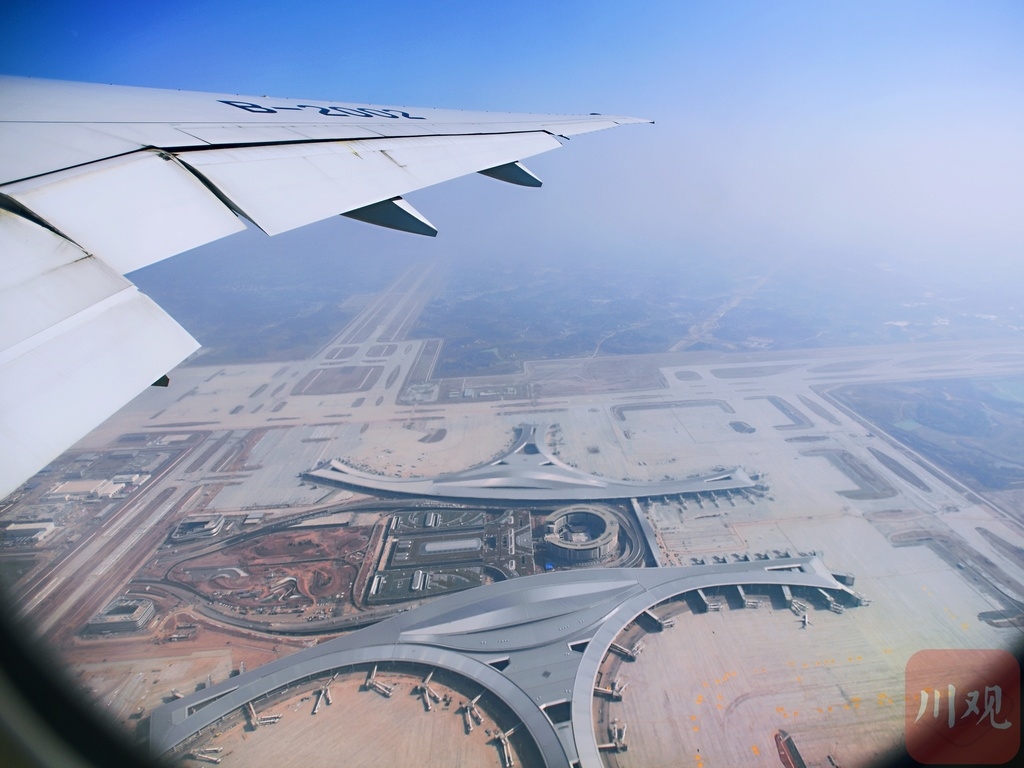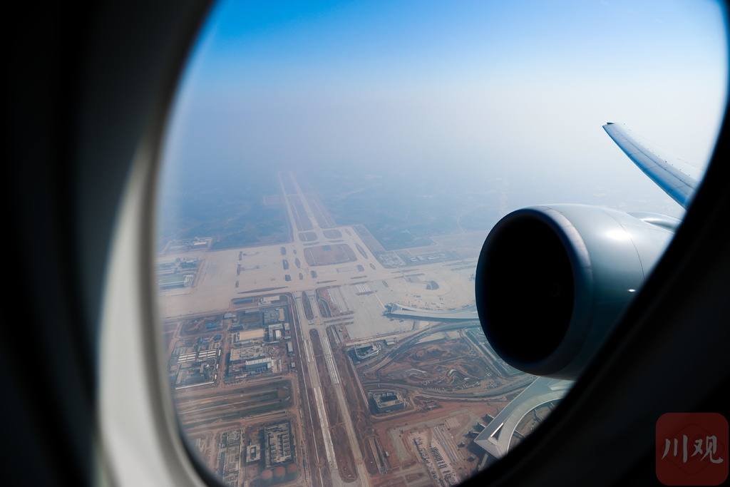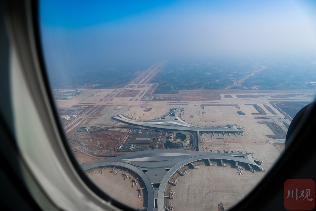 照片视角是从飞机的舷窗看出去,波音777宽体机伸展的机翼下方,即将振翅高飞的“神鸟”清晰可见,两座神鸟造型的航站楼“穿”上了铁甲,在阳光下熠熠生辉,航站楼之间是圆形“天府之眼”,正对着西跑道和东跑道。