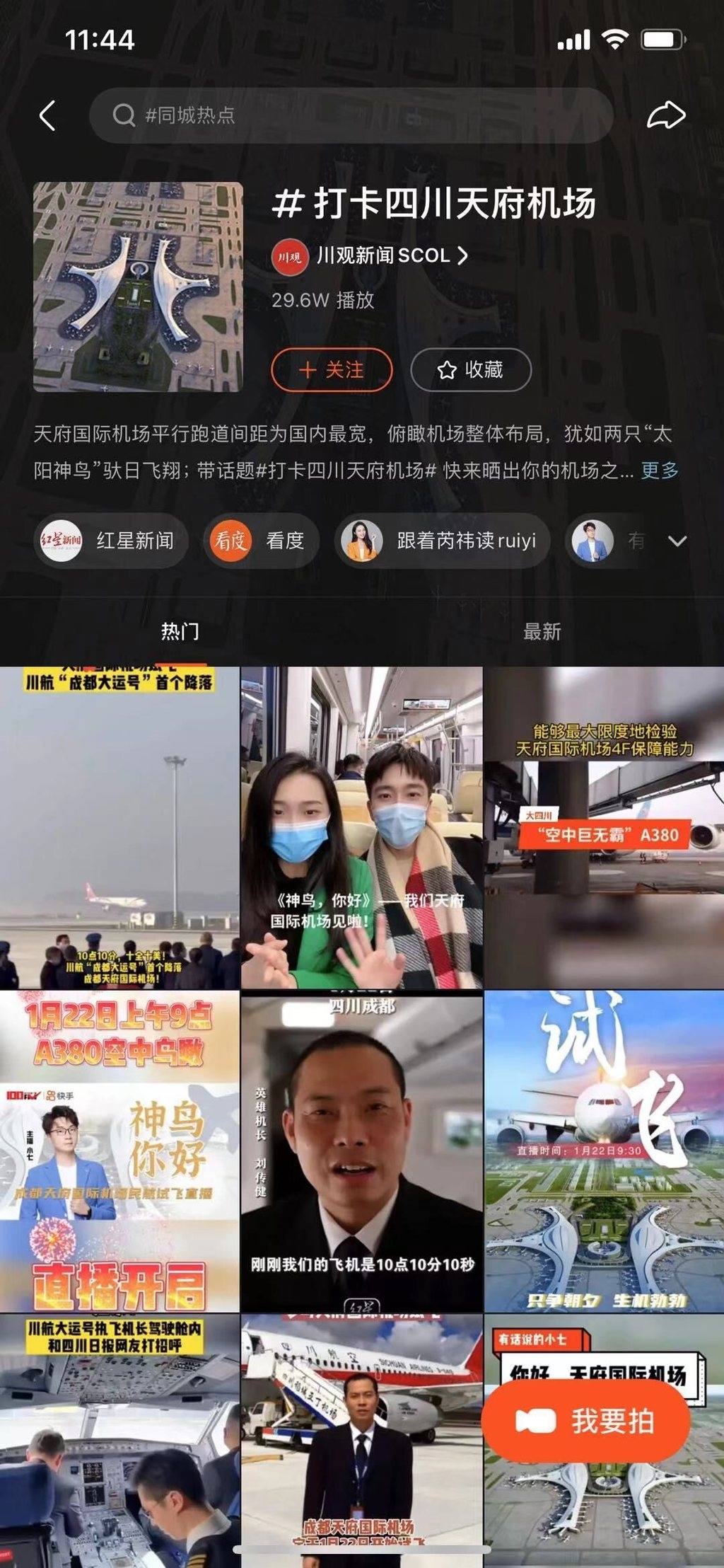 此次天府国际机场试飞,川报全媒体不仅设置了11路机位信号,派出20余名记者在地面、空中进行全媒体播报,同时也借助PUGC生产模式,进一步延伸出多样内容。