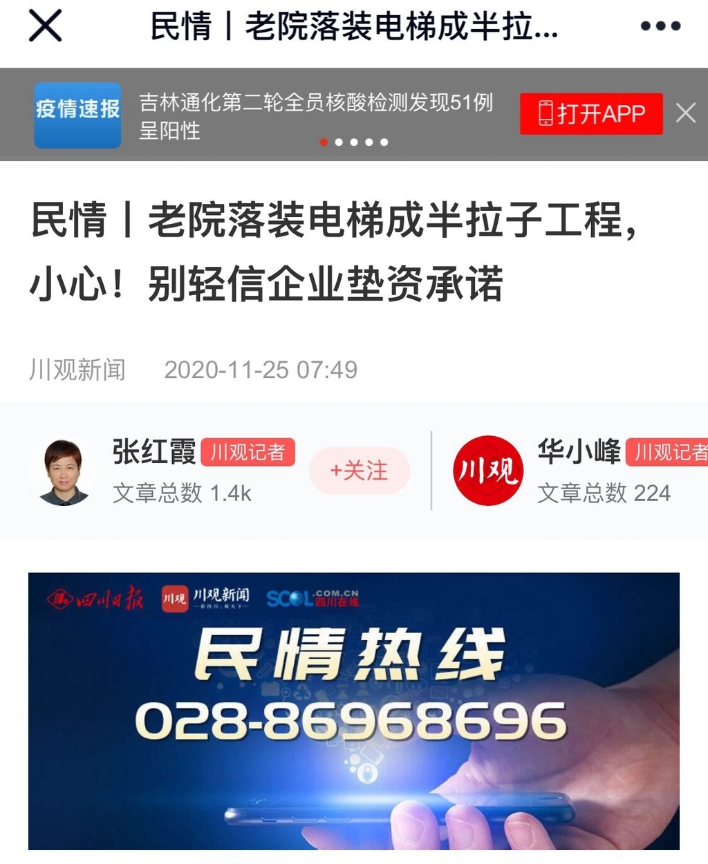 2020年11月24日,四川在线以专题、组合报道的形式,反映了该小区居民的境遇,报道出来后,引起了强烈的社会关注,成都市政府分管领导亲自过问,成都市住建局高度重视,责成锦江区相关部门尽快协调处理。在各有关方面的强力关注、支持下,小区居民重新遴选了电梯安装公司,目前工程正在进行,估计在春节前就能用上新电梯。
