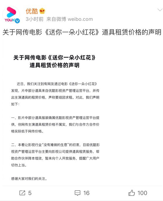 当话题不断发酵时,优酷通过官方微博发声明表示,片中大量道具通过租赁提供剧组使用,属优酷影视资产管理运营平台资产,希望帮助行业合作伙伴降本增效。