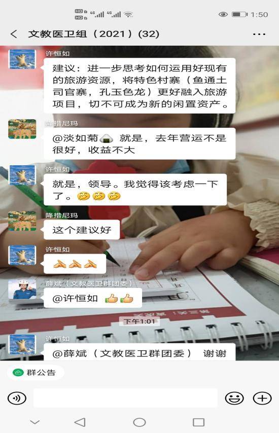 在文卫科教讨论组,委员许恒如建议,要进一步思考如何运用好现有的旅游资源,将特色村寨更好融入旅游项目,切不可成为新的闲置资产。