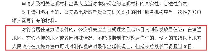 2016年1月1日起施行的《居住证暂行条例》规定,“对符合居住证办理条件的,公安机关应当自受理之日起15日内制作发放居住证”,特殊情况“延长后不得超过30日”。