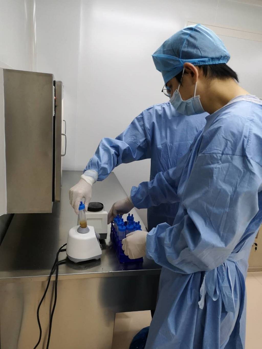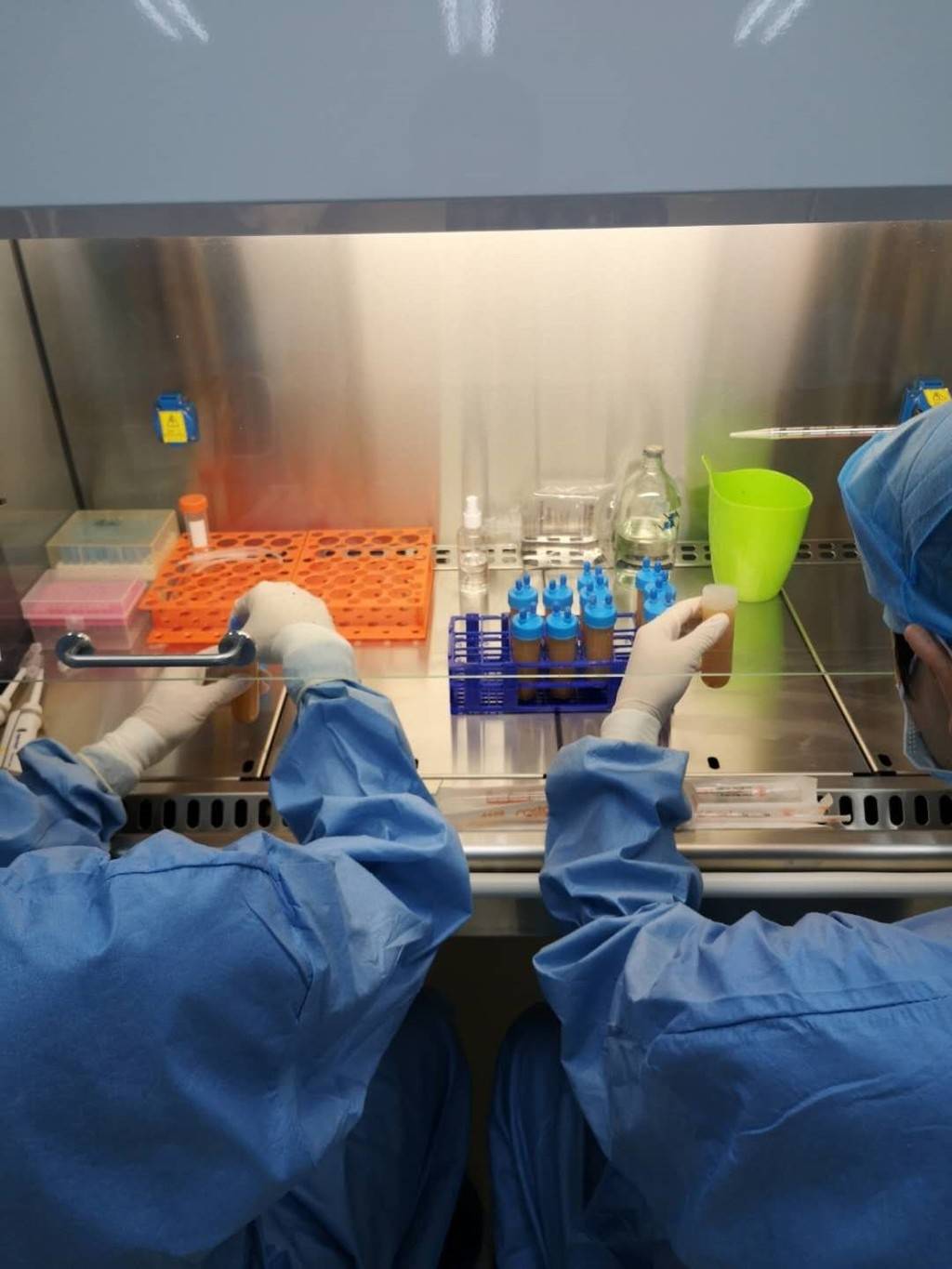 罗刚博士和胡庆博士正在进行重悬(即将生理盐水和粪便震荡旋转,使二者充分接触后,再将上清液倒掉)。西南医科大学附属医院 消化内科摄。