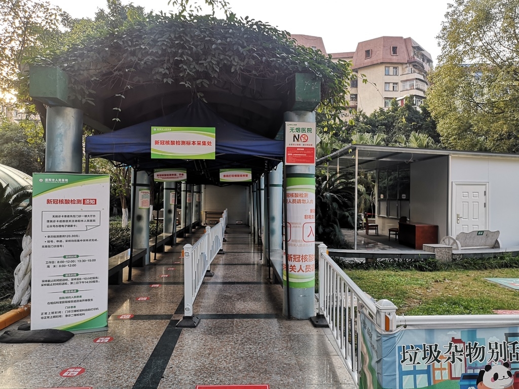 赵其勇的检测属于自愿的“愿检尽检”范畴,医院在门诊大楼右侧的一片空地上,利用原有的走廊和一间新建板房,搭建起一处针对此类人群的新冠核酸检测标本集中采集点。在他到达时,现场正有十余人按照地面标识,相互间隔1米排队采样。