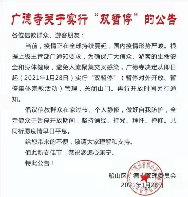 1月28日,四川在线记者从遂宁市船山区灵泉寺、船山区广德寺管理委员会获悉,即日起,灵泉寺、广德寺暂停对外开放、暂停集体宗教活动。