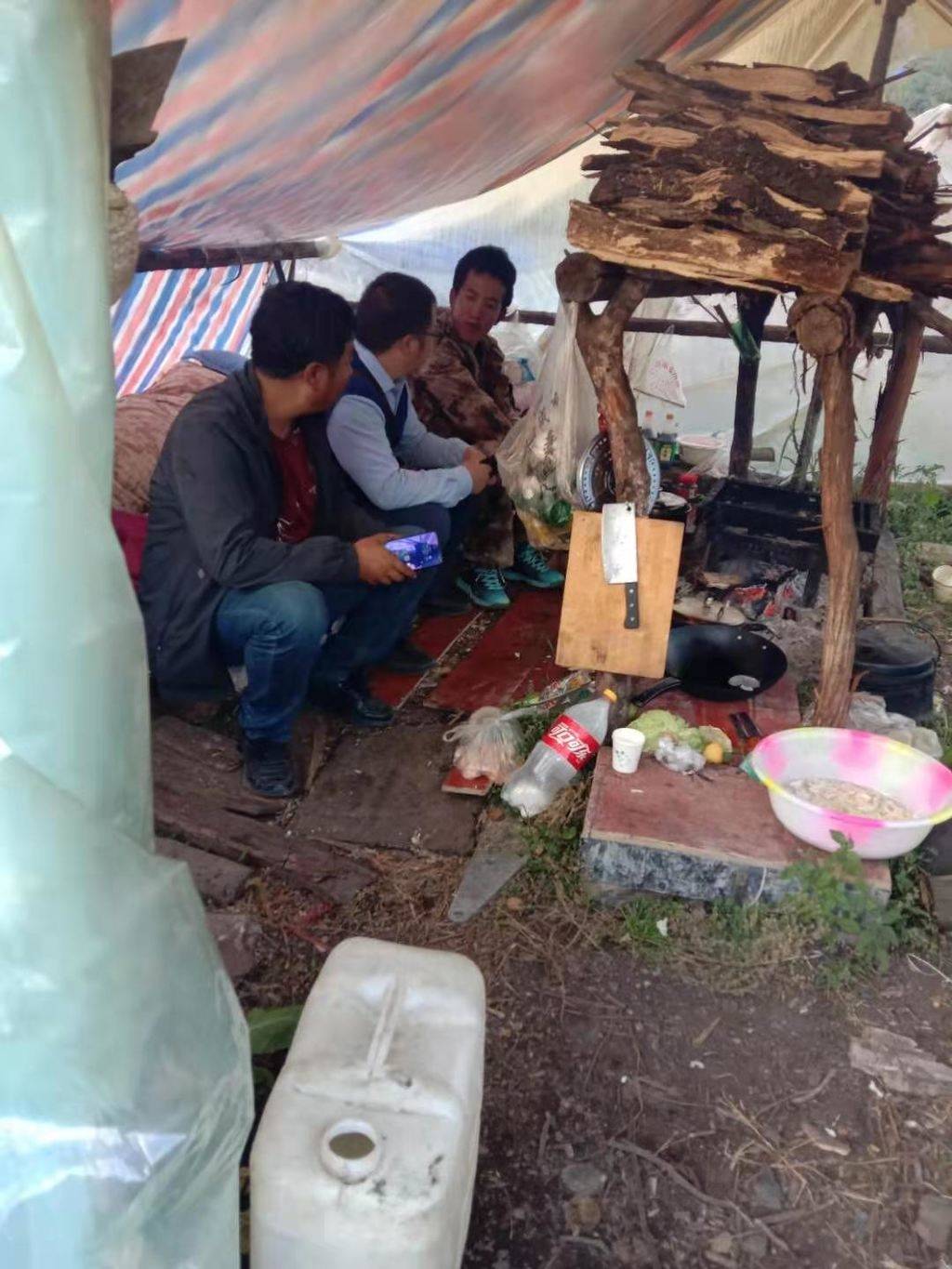 巡山护林间隙,格绒泽仁(左)在搭建的简易帐篷中吃饭。