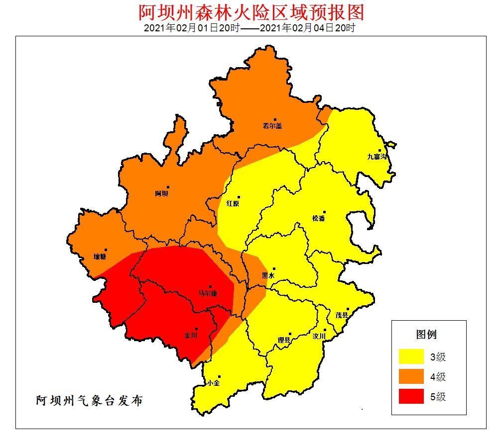 根据最新气象资料分析,预计2月2日至2月4日:阿坝州以晴间多云天气为主,空气干燥、气温偏高、降水稀少,午后到傍晚风力较大;预计未来三天全州森林草原火险气象等级普遍3级(较高),其中若尔盖县、阿坝县、壤塘县北部森林草原火险气象等级可达4级(高);马尔康市、金川县、壤塘县南部森林草原火险气象等级可达4~5级(很高)。