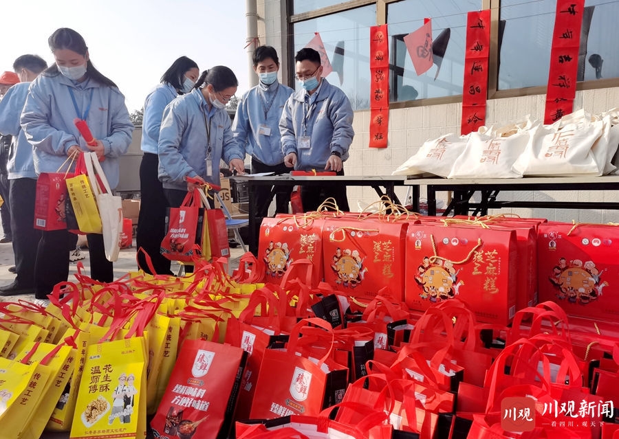 2月1日,在眉山信利高端显示科技有限公司,仁寿县文化馆工作人员正在向留岗过年的员工赠送礼包。